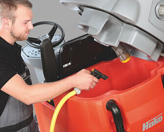 - Hako-AquaControl: saves up to 50 % of water, thanks to intelligent brush systems and our automatic water-stop function when the machine stands still.