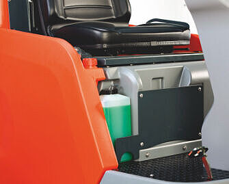 This scrubber-drier provides a perfect workplace for operators. The design of the Scrubmaster B120 R focusses on superior ergonomics – right down to the last detail. The machine is equipped with a wide range of practical features that ensure more efficient working. The comfortable seat allows a pleasant and back-friendly sitting posture. All operating elements are clearly arranged and within easy reach of the driver. Daily routine work is no problem at all thanks to easy-to-access and clearly marked components. From energy supply to tank cleaning: Any routine work can be carried out quickly and with very little effort.