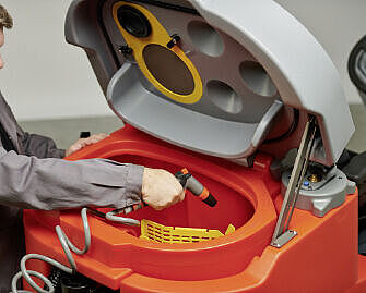 This ride-on scrubber-drier enables operators to carry out all cleaning tasks with ease. The design of the Scrubmaster B175 R is consistently ergonomic – and has been developed with much attention to detail. The comfortable workplace allows pleasant working and a back-friendly sitting posture. All operating elements are in clear view and within easy reach of the driver. Daily routine work is no problem at all thanks to easy-to-access and clearly marked components. From energy supply to tank cleaning: Any routine work can be carried out quickly and with very little effort.