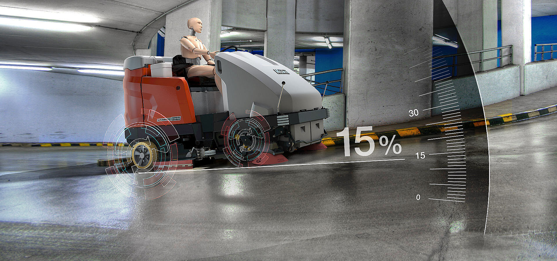 In der Variante mit elektronisch modulierendem X-AC-Front- und Heckantrieb werden die Scrubmaster Ride-on-Scheuersaugmaschinen mit einer verbesserten Traktion während der Reinigungsfahrt unterstützt. Insbesondere Steigungen und Rampen von bis zu 15 % können dank X-AC im Reinigungsmodus mit unverminderter Leistung mühelos bewältigt werden. So können Reinigungsarbeiten in Einsatzbereichen mit ebenen sowie an- und absteigenden Flächen wie beispielsweise in mehrstöckigen Parkhäusern einfach geplant und ausgeführt werden. Eine zusätzliche manuelle Reinigung der Rampen entfällt – das spart Zeit und Kosten.