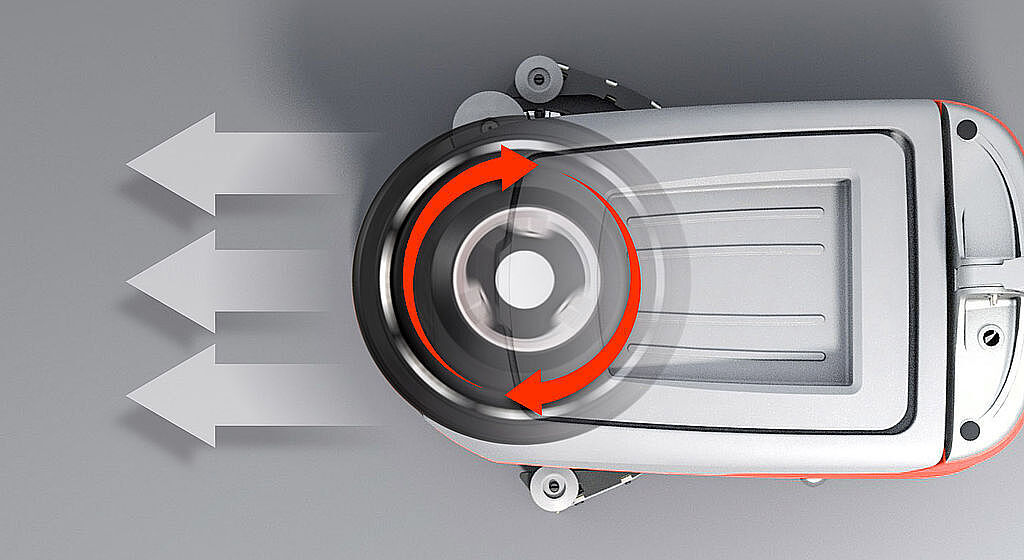 Mit Powerflow-System: Der Scrubmaster B25 lässt sich dank automatischem Vortrieb durch die Rotation der Bürste mit geringem Kraftaufwand bewegen.