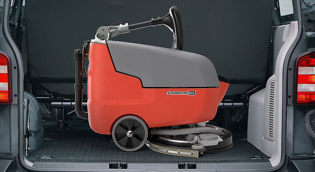 Immer schnell zur Stelle: Dank klappbarem Bedienholm lässt sich der Scrubmaster B25 in kompakte Form für den Transport im Kofferraum bringen.